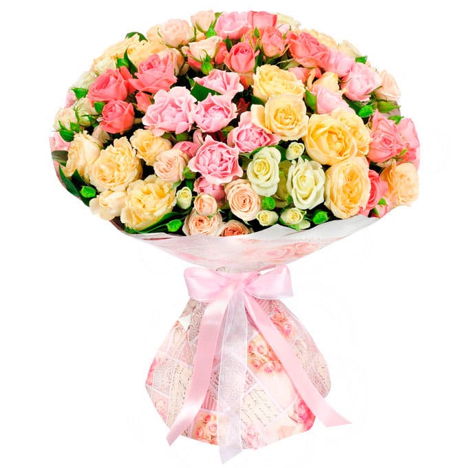 Этот букет из кустовых роз в нежных оттенках жёлтого и розового создаёт атмосферу лёгкости и радости. В составе букета — жёлтые и розовые кустовые розы. Упаковка выполнена из матовой плёнки и крафт-бумаги, украшена розовой атласной лентой. Композиция дарит ощущение весеннего праздника. Подарок для любимой на День влюблённых.
