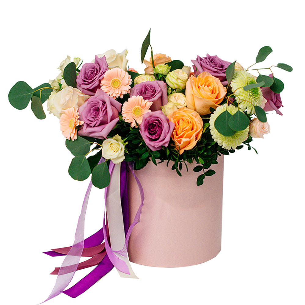 Этот букет из сиреневых и персиковых роз одноголовых, кремовых гербер мини и кустовых роз в пастельных тонах вызывает чувство умиротворения. Композиция оформлена в элегантной шляпной коробке нежного розового цвета, дополненной разноцветными лентами. Такое оформление создаёт атмосферу лёгкости и весеннего обновления. Идеально подходит для подарка любимой женщине на годовщину.
