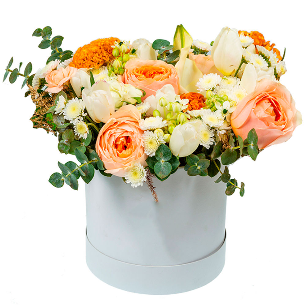 Эта композиция в нежных персиковых и белых тонах создаёт атмосферу романтики и свежести. В букете представлены пионовидные персиковые розы, белые тюльпаны, кустовые ромашки, эвкалипт, целозия и кремовые мини-гвоздики. Все цветы аккуратно оформлены в белую шляпную коробку, придающую элегантности. Этот букет станет отличным подарком для подруги на День матери.