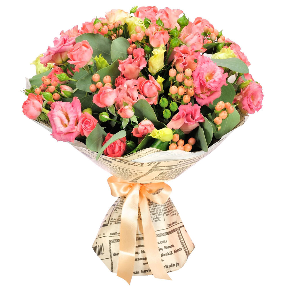 Этот букет поражает сочетанием розовых и жёлтых оттенков, создавая радостное настроение. В его составе розовая и жёлтая эустома, гиперикум, розовая кустовая роза и эвкалипт. Упакован в крафт-бумагу с газетным принтом, перевязанную атласной лентой пастельного цвета. Эта композиция создаёт атмосферу весенней свежести и лёгкости. Идеально подойдёт для подарка на юбилей любимой женщине.