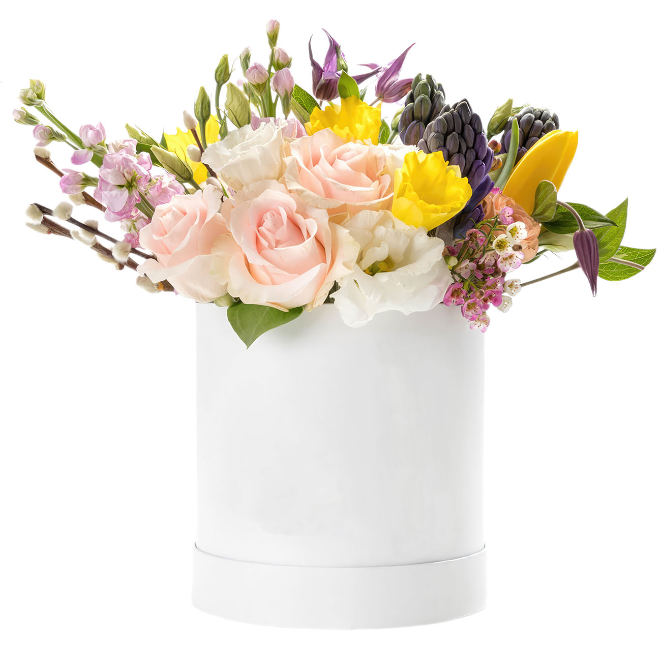 Эта композиция из нежно-розовых роз, белых эустом, жёлтых тюльпанов и сиреневых гиацинтов погружает в атмосферу весеннего настроения. Все цветы аккуратно собраны в элегантную белую шляпную коробку, что добавляет изысканности. Такой букет способен создать атмосферу лёгкости и радости. Идеально подойдёт для поздравления мамы на День матери.