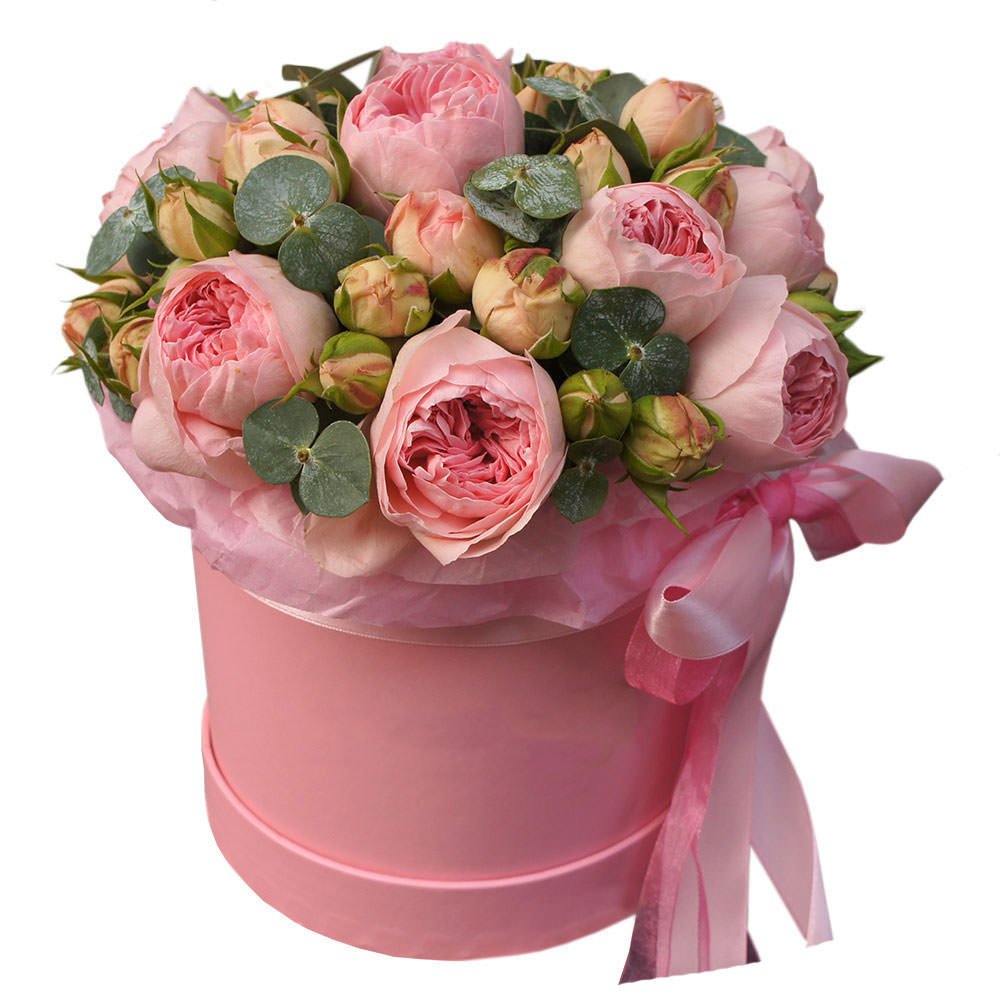 Нежные розовые оттенки создают атмосферу утончённости и романтики. В состав входят пионовидные розовые розы, кустовые розовые розы и эвкалипт. Композиция оформлена в стильной розовой шляпной коробке с атласной лентой. Идеальный подарок на День влюблённых для любимой женщины.